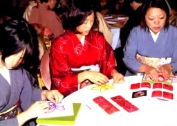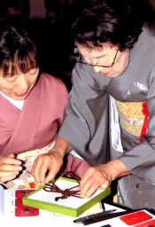 | 紐結び練習中!先代家元夫人も各席をまわって、御教授くださいました。 | ||