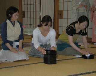 今日のテーマは「大寄せ濃茶席」全員を3グループに分け、大寄せ茶会の裏表全てが理解できるように、大広間で研修しました。