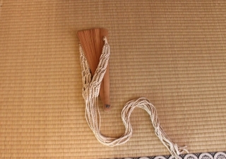 | 床に飾った、代々の九条家当主お使いの「檜扇」 男性は笏を持つもの・・と、思っておりましたが、檜扇も 白木の清々しい扇です。 |