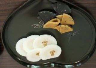 | 当流は、徳川家に旗本として仕えておりましたので、干菓子は葵盆に、 これも打出庵大黒屋さんご考案の平氏家紋の揚羽蝶(床の花が平敦盛)と菖蒲を押した麩煎餅を盛りました。 |