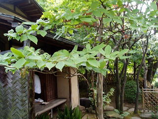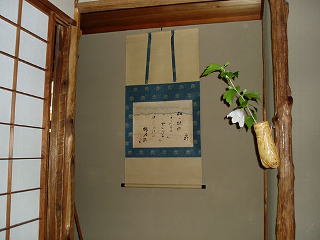 | 猛暑の茶事も、青々とした樹木や、軒深い伝統的茶室のおかげで清々しい情景となりました。 | |